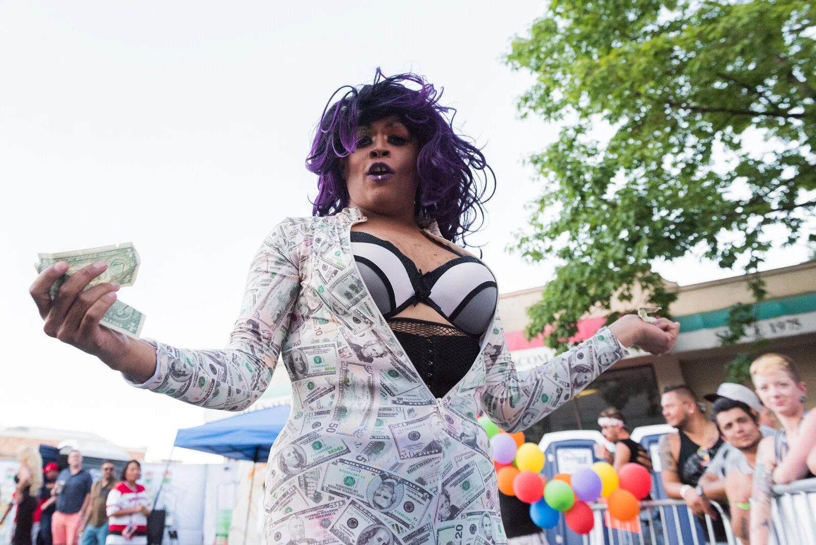 Drag performance artist Sally Cannoli takes selfies with block party fans.